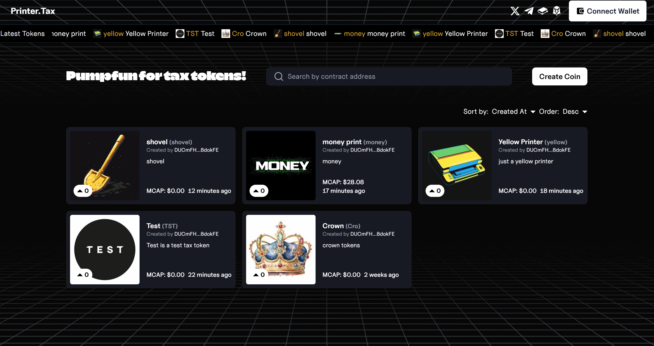 **Printer.tax** is a solana-based (2022 standard) platform for launching tokens with an automated 5% transaction fee and a built-in revenue distribution system. Every transaction (buy, sell, or transfer) incurs a 5% fee that gets distributed every 5 minutes to token holders and/or other designated allocations according to preset parameters.